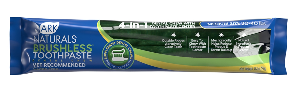 Ark Naturals Breath-Less Brushless Toothpaste Dog Chews clean your pups teeth as she chews, thanks to abrasive ridges on the outside and Ark Naturals patented toothpaste center. Each tasty bite fights plaque, removes tartar, and freshens breath!