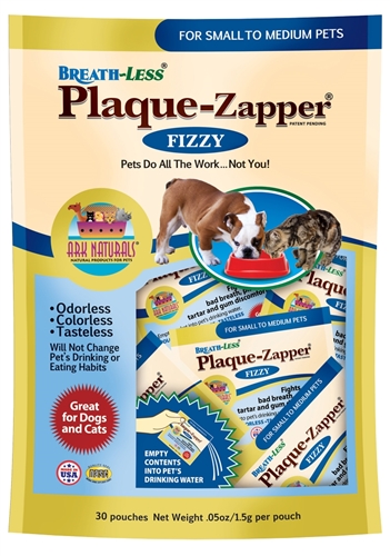 Ark Naturals Breath-Less Plaque Zapper Dog & Cat Pouches keep teeth and gums healthy by neutralizing ph levels in your pets saliva and preventing harmful bacteria from growing. Pour one packet into your pets drinking water every day, and the tasteless, odorless, colorless miracle goes to work!Active Lysozyme Glucoxidase Amylase Papain Amyloglucosidase Peptizyme Lactoferrin Inactive Maltodextrin Citric Acid Sodium Bicarbonate”