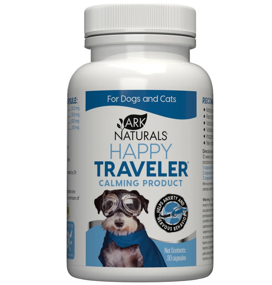 The world can be a scary place for a pup! Add our natural herbal calming formula to any stressful situation and watch the worry wash away. Ark Naturals’ Happy Traveler® capsules help ease motion sickness during long car rides or jet setting around. Made with four powerful calming ingredients, we guarantee one Happy Traveler.