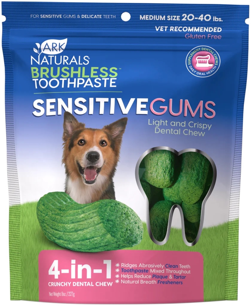 Does your dog have tooth trouble? Our Sensitive Gums Brushless™ Toothpaste was developed with your pup in mind! Ideal for cracked teeth, surgeries, missing teeth or dogs that are prone to dental sensitivity. Our light, airy textured chews are easier to consume and won’t stick to teeth but packed with the same effective ingredients as the original formula.