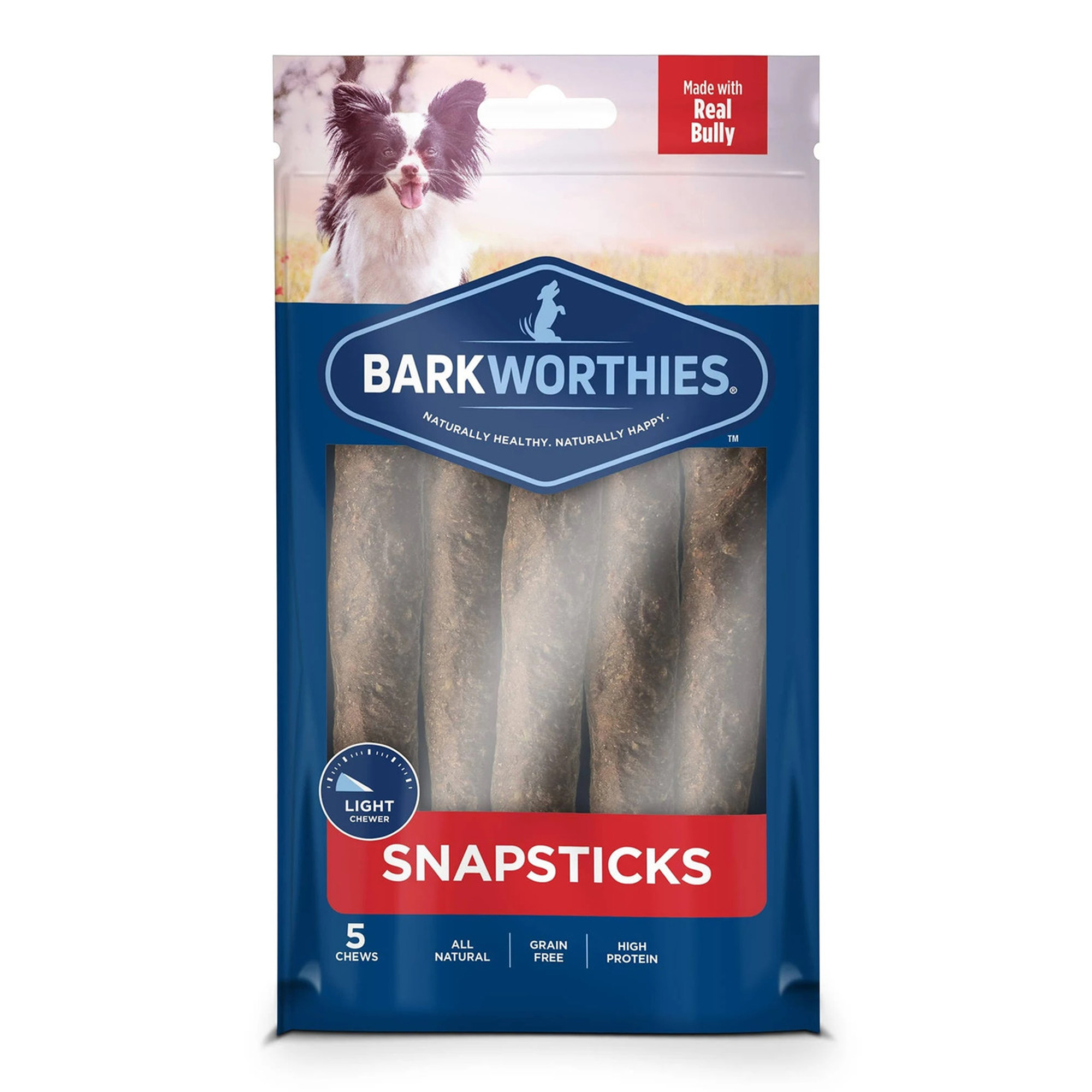Barkworthies Snapsticks Grain-Free Dog Treats, 5 count; Your pooch will go head-over-tail for the irresistible crunch of the Barkworthies Snapsticks Grain-Free Dog Treats. These treats are formulated with natural ingredients, made without grains and rich in protein for a treat that is both nutritious and delicious. They also promote an easy digestion, so you can feel good about rewarding your pooch with these chews. Pooches of all sizes won t be able to resist their beefy flavor. Plus, they re great for grabbing on the go!