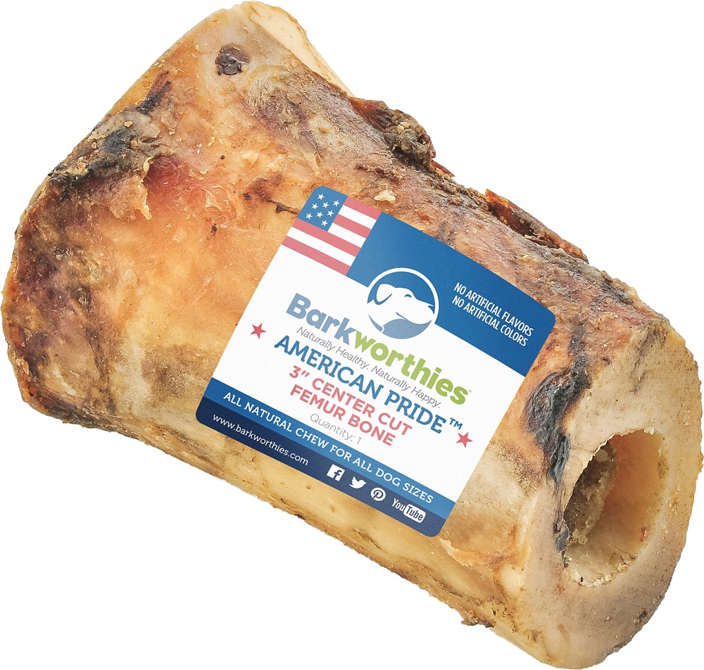 Some of the best things in life come from nature, including this Barkworthies American Pride 3??? Center Cut Femur Bone Dog Chew. Made in the USA from only center cut femur bone, this 100% natural dog chew is baked with pieces of tendon and meat that will have your dog drooling with delight. Not only is this treat delicious but it???s nutritious too! The savory bone marrow serves as an excellent source of digestible calcium to encourage strong bones and teeth, while iron and zinc from the bone help your pal fight off infections. Best of all, this flavorful femur will keep your canine companion busy for hours and free from boredom. Your pup is worthy of a healthy treat that???s tasty too, so reward him with Barkworthies!