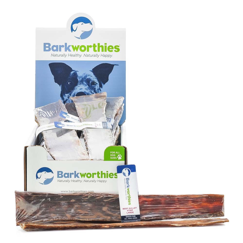 Barkworthies Beef Gullet Strips are high-protein dog chews made from high quality beef and are as delicious are they are nutritious! Our Beef Gullet Strips clean your dog’s teeth as he or she gnaws, in addition to preventing buildup of tartar and plaque. These healthy dog treats also feature a natural source of glucosamine – an amino acid shown to aid in joint health. Most Barkworthies’ all-natural dog treats and chews are completely preservative-free and additive-free. Please note that this product is not for human consumption. Please supervise your pet while giving a treat or chew and dispose of properly if it becomes a choking hazard or develops sharp edges.
