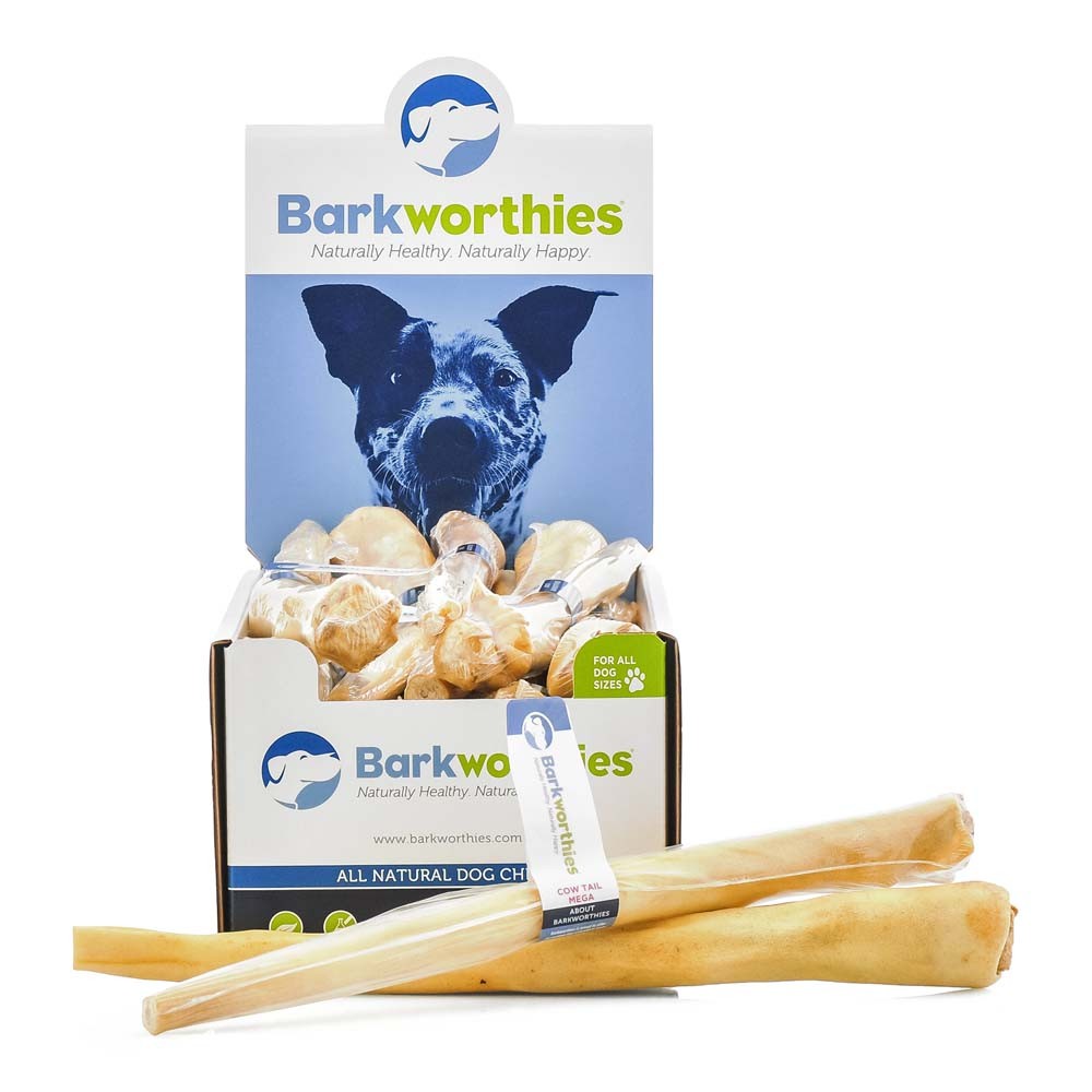 Barkworthies Mega Cows Tail is a massive, thick chew perfect for large dogs with large appetites. Cut from the base of the cows tail, it starts crunchy then becomes chewy, so your dog wont get bored during chew time! The Barkworthies Mega Cows Tail is highly digestible, and the texture helps scrub away tartar, making it great for the oral health of your dog. This is an all-natural product produced from free-range grass-fed cattle. Most Barkworthies all-natural dog treats and chews are completely preservative-free and additive-free. Please note that this product is not for human consumption. Please supervise your pet while giving a treat or chew and dispose of properly if it becomes a choking hazard or develops sharp edges.All-Natural Beef”
