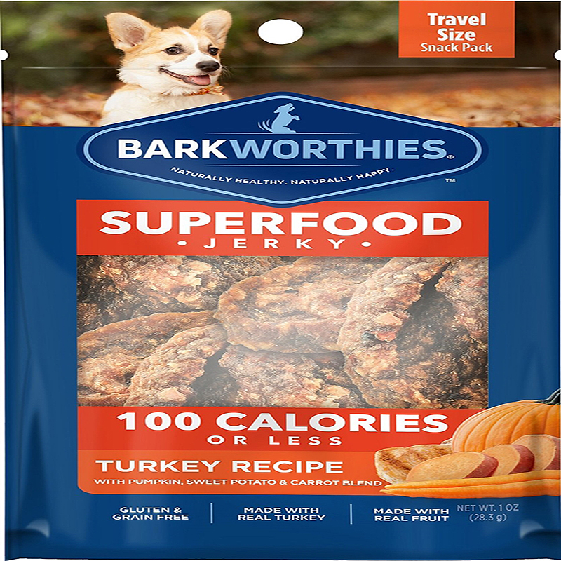 Barkworthies Turkey Jerky Recipe with Pumpkin, Sweet Potato & Carrot Blend Dog Treats are the perfect on-the-go snack for your pal. At just 100 calories per serving, this jerky is made with high-quality protein from real turkey and healthy superfoods including pumpkin, sweet potato and carrots. Plus, they can be used as a tasty training treat. Barkworthies turkey jerky combines convenience, mouthwatering flavor and nutrition all in one easy snack your dog will love!
