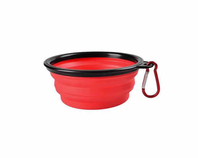 Collapsible travel water and dog food bowl with red carabiner. FDA Approved and made from 100% thick food-grade silicone, durable, lightweight, dishwasher safe and convenient. Clip it or collapse it for backpacks, pockets, purses and glove boxes.
