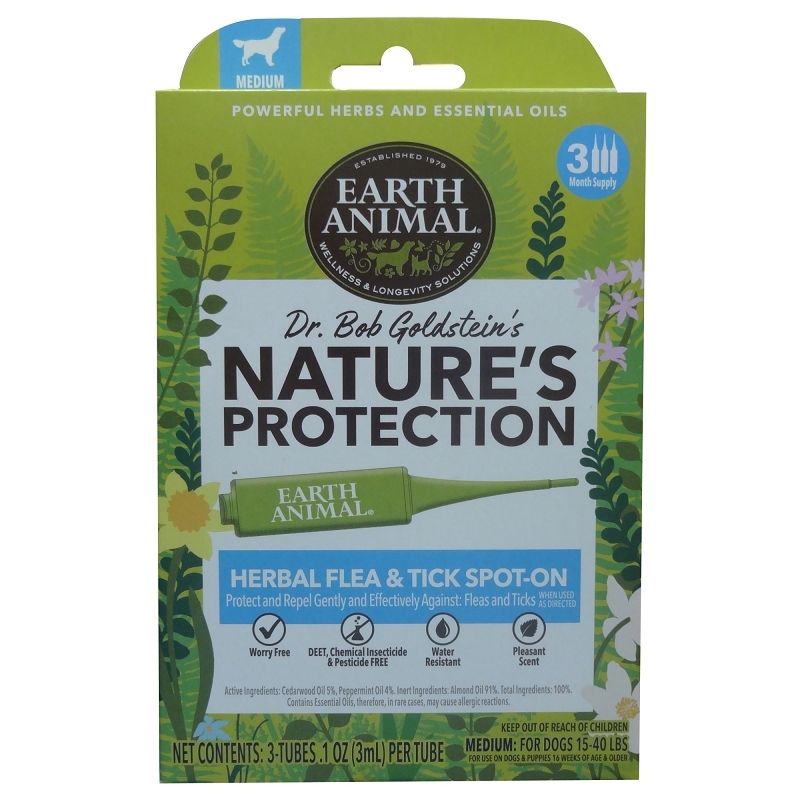 Earth Animal Natures Protection Herbal Spot-On provides a naturally effective alternative to topical flea & tick repellent treatments made with harsh chemicals and insecticides. Formulated by Dr. Bob Goldstein, this product features a natural blend of aromatic herbs and soothing essential oils with a fresh, minty fragrance that protects the skin from biting fleas and ticks.