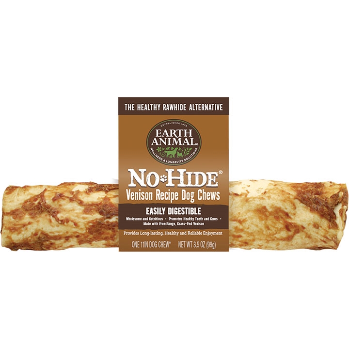 Let your dog unleash their inner chewing monster with all-natural and safe chews from Earth Animal! These chews are a great alternative to rawhide and are made from high-quality wild game meat that contain no growth hormones or steroids. They are long lasting for even the most avid of chewers! They are also easily digestible for sensitive tummies and picky eaters. Wild game meats, like venison, are also great for dogs with allergies or sensitivities. Earth Animal No-Hides contain low-sodium muscle meat that is packed with protein, Vitamin B, Zinc, and Phosphorus. No artificial additives. Made in USA.Venison, Brown Rice Flour, Agar-agar, Organic Eggs, Olive Oil, Banana Powder, Bromelain (Pineapple)”