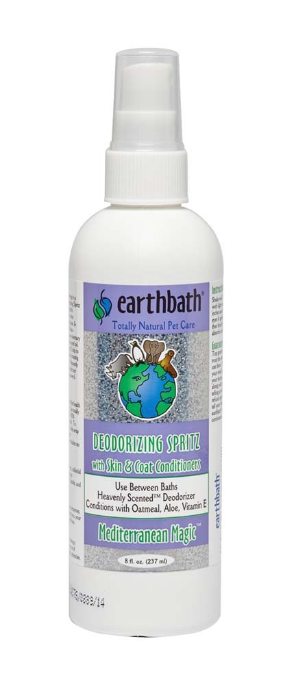 This 3-in-1 Deodorizing Spritz naturally conditions and detangles coats, while deodorizing with the fresh botanical fragrance of rosemary oil. Organic aloe vera and vitamin E leave the coat exceptionally soft and bright. Use between baths to freshen, condition and detangle, or as a finishing spray after bathing your dog with earthbath shampoo. Safe for dogs over 6 weeks old. Not for use on cats. Naturally conditions and detangles coats|Deodorizes with the fresh botanical fragrance of rosemary oil|Organic aloe vera and vitamin E leave the coat exceptionally soft and bright|Safe for dogs over 6 weeks old|Not for use on cats|Pump sprayDe-ionized Water, Natural Conditioners, Colloidal Oatmeal, Aloe Vera, Vitamin E, Rosemary Essence.”