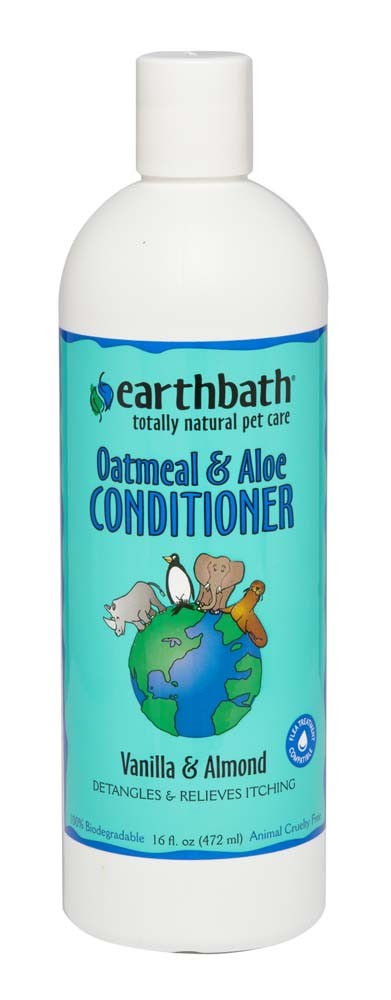 earthbath proudly formulated this shine enhancing Oatmeal & Aloe Conditioner with botanical fragrances of vanilla & almond to effectively detangle, enrich, and revive your pets coat. The addition of colloidal oatmeal, organic shea butter and organic aloe vera help re-moisturize and soothe skin, too. This sumptuous conditioner will leave your best friends coat soft and plush while bringing out its natural luster and brilliance. Used in conjunction with earthbath Oatmeal & Aloe shampoo, and your pets coat will be plush and smell naturally fresh. Will not wash off topical flea applications. Safe for all animals over 6 weeks. Helps Relieve Itchy Dry Skin|Detangles, enriches, and revive your pets coat|Colloidal oatmeal and organic aloe vera help re-moisturize and soothe itchy, dry skin|Will not wash off topical flea applications|Safe for all animals over 6 weeksPurified water, vegetable-derived conditioner & detangler, colloidal oatmeal, organic aloe vera, organic shea butter, cetearyl alcohol, hydrolyzed silk protein, botanical fragrances of vanilla & almond, preservative.”