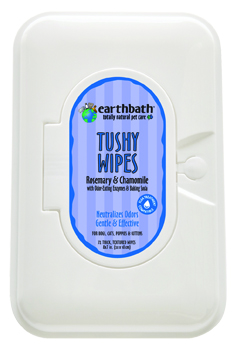 earthbath? Tushy Wipes offer a safe and convenient way to keep your pet’s tush fresh, clean and odor free between baths. Gentle and non-irritating, these wipes are formulated to neutralize unpleasant odors with rosemary oil, baking soda, and saccharomyces ferment filtrate (odor-eating enzymes). Mild cleansers remove stuck on mess and stains, while chamomile naturally helps soothe the skin. These wipes are the professional groomer’s choice to express anal glands, which helps alleviate booty-dragging behavior (smile, you know the dance…). Safe for all animals over 6 weeks old.