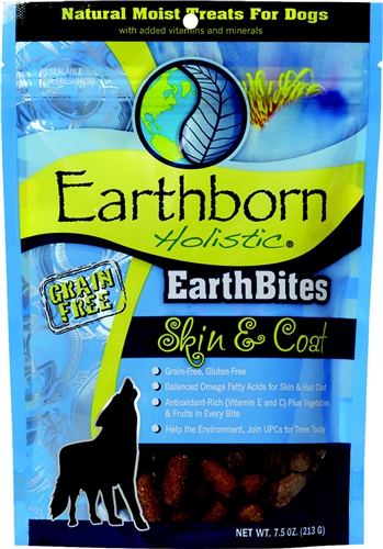 Earthborn Holistic EarthBites Skin & Coat moist treats are a satisfying snack for all dogs, especially those looking to achieve or maintain a healthier outer appearance. The balanced ratio of Omega-6 and Omega-3 fatty acids plays a vital role in healthy skin, hair coat and immune function. This special formula contains lean, whitefish and salmon meal proteins blended with peas, apples, blueberries, carrots and spinach for high palatability. Your dog will enjoy the taste of these nutritious, grain-free treats.