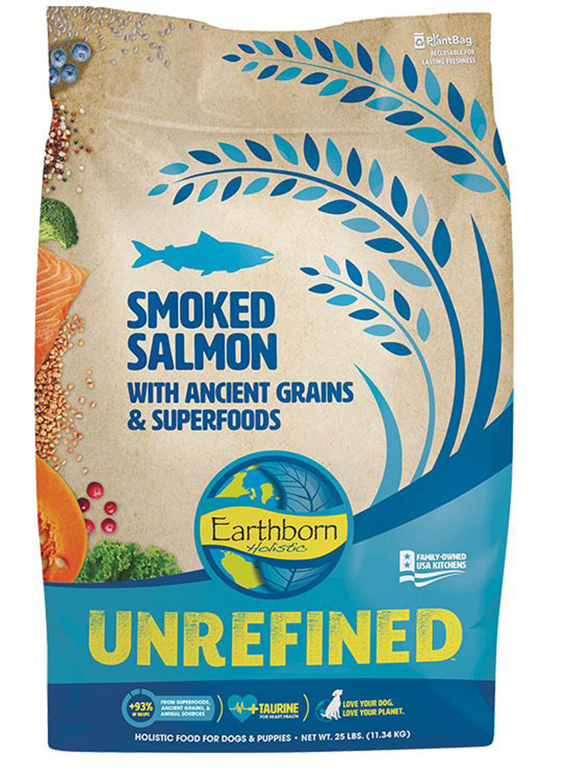 Your dog will go head over tail for Earthborn Holistic’s Unrefined Smoked Salmon with Ancient Grains & Superfoods Dry Dog Food. This recipe features ancient grains that are harvested from trusted sources like family farms. It also features a nutritious blend of superfoods and smoked salmon as the #1 ingredient for a high-quality protein source to fuel your furry friend’s muscles! It’s just full of the good stuff and none of the stuff that might upset your buddy’s tummy like peas, lentils, legumes, chicken or potatoes. And since your dog’s food should be as true as the bond you share, you won’t find any fillers, artificial colors, flavors or preservatives in here!