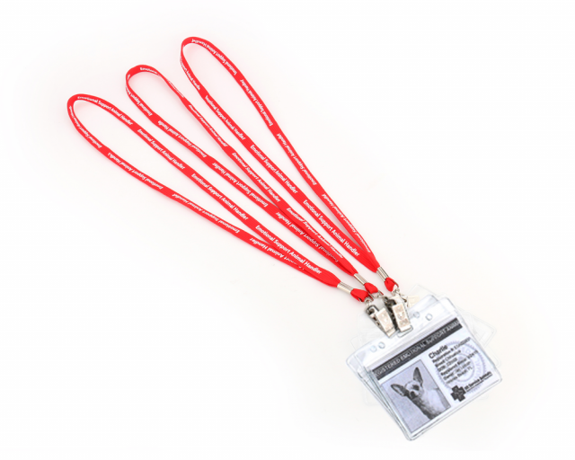 Emotional Support Animal lanyard with clip and plastic badge holder that’s clear on both sides. Worn around your neck, your information can be seen in the event of an emergency.