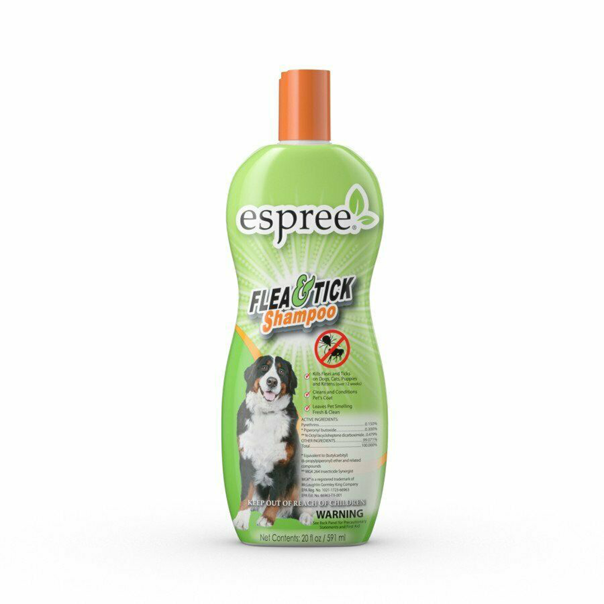Espree Flea & Tick Shampoo kills fleas and ticks on Dogs, Cats, Puppies and Kittens. Espree Flea & Tick Shampoo also Cleans and Conditions the coat and leaves the pet smelling fresh and clean.