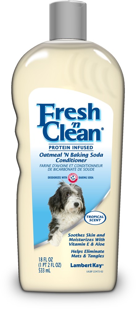 Conditioner Fresh N Clean Oatmeal & Baking Soda Simplifies Brushing And Combing By Helping To Eliminate Mats And Tangles. A Wholesome Blend Of Wheat Protein Soothing Blend Of Natural Colloidal Oatmeal Arm & Hammer Baking Soda Aloe Vera Pure Water Gentle Cleansing And A Tropical Scent Purified water, thickening agent (hydroxyethylcellulose, cetearyl alcohol), conditioning agent (stearalkonium chloride) fragrance, anti-irritation (oatmeal extract), deodorizer (sodium bicarbonate), soothing agents (Vitamin E, aloe barbadensis leaf juice), coloring agents, polysorbate 20, preservative.”