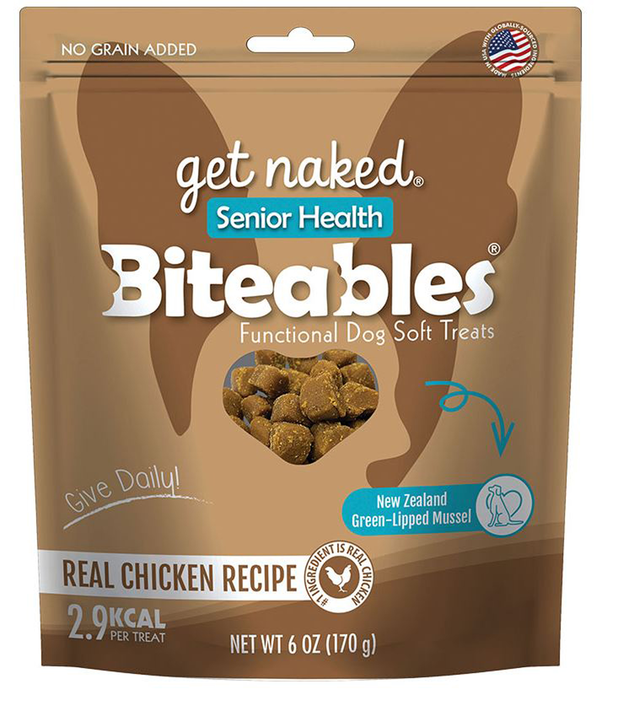 Biteables Senior Health Functional Soft Treats are formulated with New Zealand green-lipped mussel that has antioxidants to support heart and brain health, and natural chondroitin to support joint health. Made with real chicken, sweet potatoes and turmeric, this tiny treat packs a big punch of flavor at just 2.9 calories per treat.
