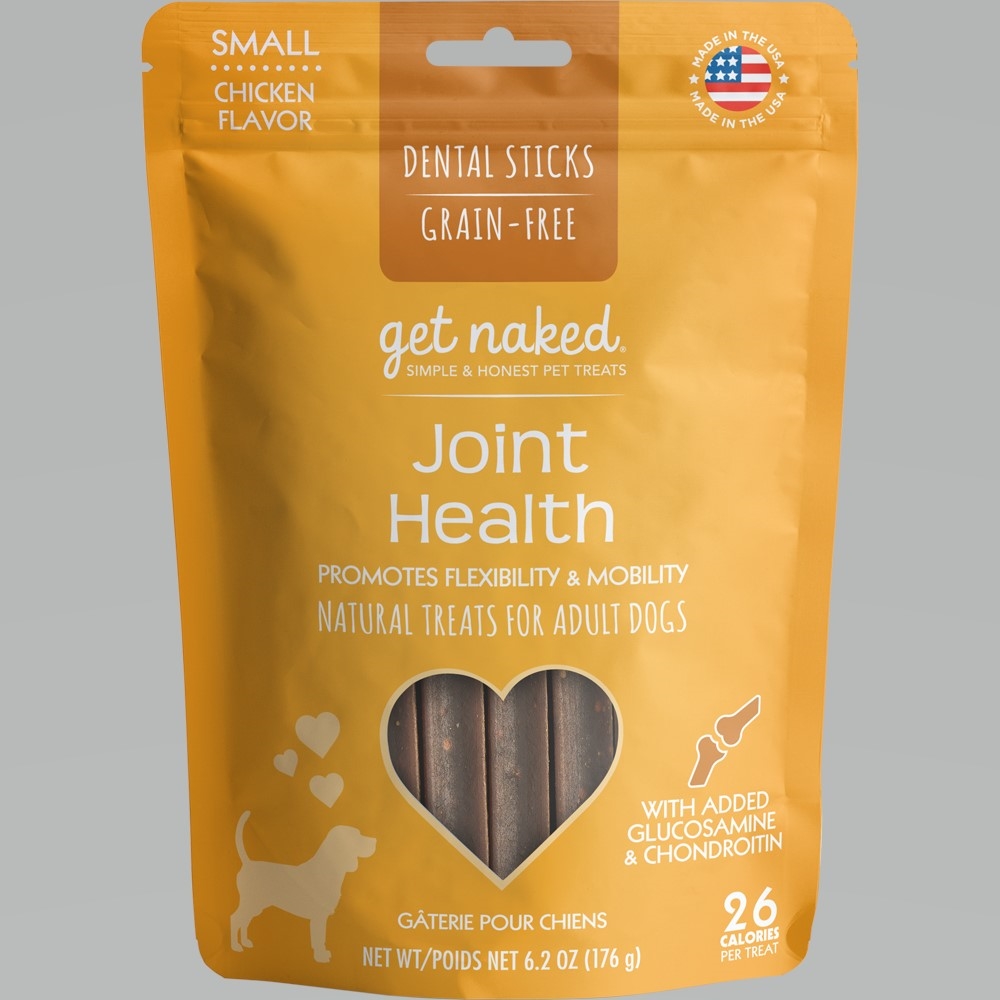 Your furry companion will gain the joint supporting benefits of Get Naked Joint Health chew sticks, while enjoying the scrumptious chicken flavor.Dried potatoes, vegetable glycerin, gelatin, water, chicken, natural chicken flavor, organic flaxseed, parsley, chia seed, glucosamine hydrochloride (from shellfish), chondroitin sulfate, agar-agar, fish oil (source of DHA), capsicum, peppermint.. Crude Protein Mini 20.0%|Crude Fat Mini 2.5%|Crude Fat Max 4.0%|Crude Fiber Max 3.0%|Moisture Max 15.0%|Calcium Max 0.35%|Sodium Max 0.24%|Docosahexaenoic Acid (Dha) Mini 0.05%|Glucosamine Hci Mini 0.38%|Chondroitin Sulfate Mini 0.22%|Calorie Content 2950 kcal ME/kg|26 kcal ME/small stick|94 kcal ME/large stick”