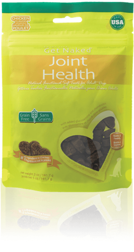 Get Naked Joint Health soft treats for adult dogs are formulated with glucosamine and chondroitin to help improve mobility and flexibility. Chicken is the number one ingredient and these delicious treats are grain free. Get Naked Joint Health soft treats can be used in conjunction with other Get Naked treats for good overall health and well-being. Their small size makes them ideal for rewards during training sessions, as well as a regular anytime treat.Chicken, sweet potatoes, vegetable glycerin, water, natural chicken flavor, sunflower oil (preserved with citric acid), fish oil (source of DHA), phosphoric acid (a preservative), citric acid (a preservative), glucosamine hydrochloride (from shellfish), chondroitin sulfate, mixed tocopherols (a preservative). Crude Protein Mini 20.0%|Crude Fat Mini 8.0%|Crude Fat Max 12.0%|Crude Fiber Max 2.0%|Moisture Max 20.0%|Calorie Content 3250 kcal ME/kg|4.9 kcal ME/treat”