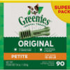 One GREENIES Original Dental Treat a day is all it takes for clean teeth, fresh breath and a happy dog. Your dog cant wait to sink their teeth into these delicious, original-flavor dental dog chews because they feature a delightfully chewy texture that fights plaque and tartar. Irresistibly tasty and incredibly powerful, GREENIES Treats for Dogs are recommended by veterinarians for at-home oral care. Best of all, these natural dog treats are made with highly soluble that are safe and easy to digest. Give your dog the mouth-wowing treat that helps promote their overall health with GREENIES Dog Treats. Wheat Flour, Glycerin, Wheat Gluten, Gelatin, Water, Powdered Cellulose, Lecithin, Minerals (Dicalcium Phosphate, Potassium Chloride, Calcium Carbonate, Magnesium Amino Acid Chelate, Zinc Amino Acid Chelate, Iron Amino Acid Chelate, Copper Amino Acid Chelate, Manganese Amino Acid Chelate, Selenium, Potassium Iodide), Natural Poultry Flavor, Choline Chloride, Fruit Juice Color, Vitamins ( Dl-Alpha Tocopherol Acetate [Source Of Vitamin E], Vitamin B12 Supplement, D-Calcium Pantothenate [Vitamin B5], Niacin Supplement, Vitamin A Supplement, Riboflavin Supplement [Vitamin B2], Vitamin D3 Supplement, Biotin, Thiamine Mononitrate [Vitamin B1], Pyridoxine Hydrochloride [Vitamin B6], Folic Acid), Turmeric Color.”
