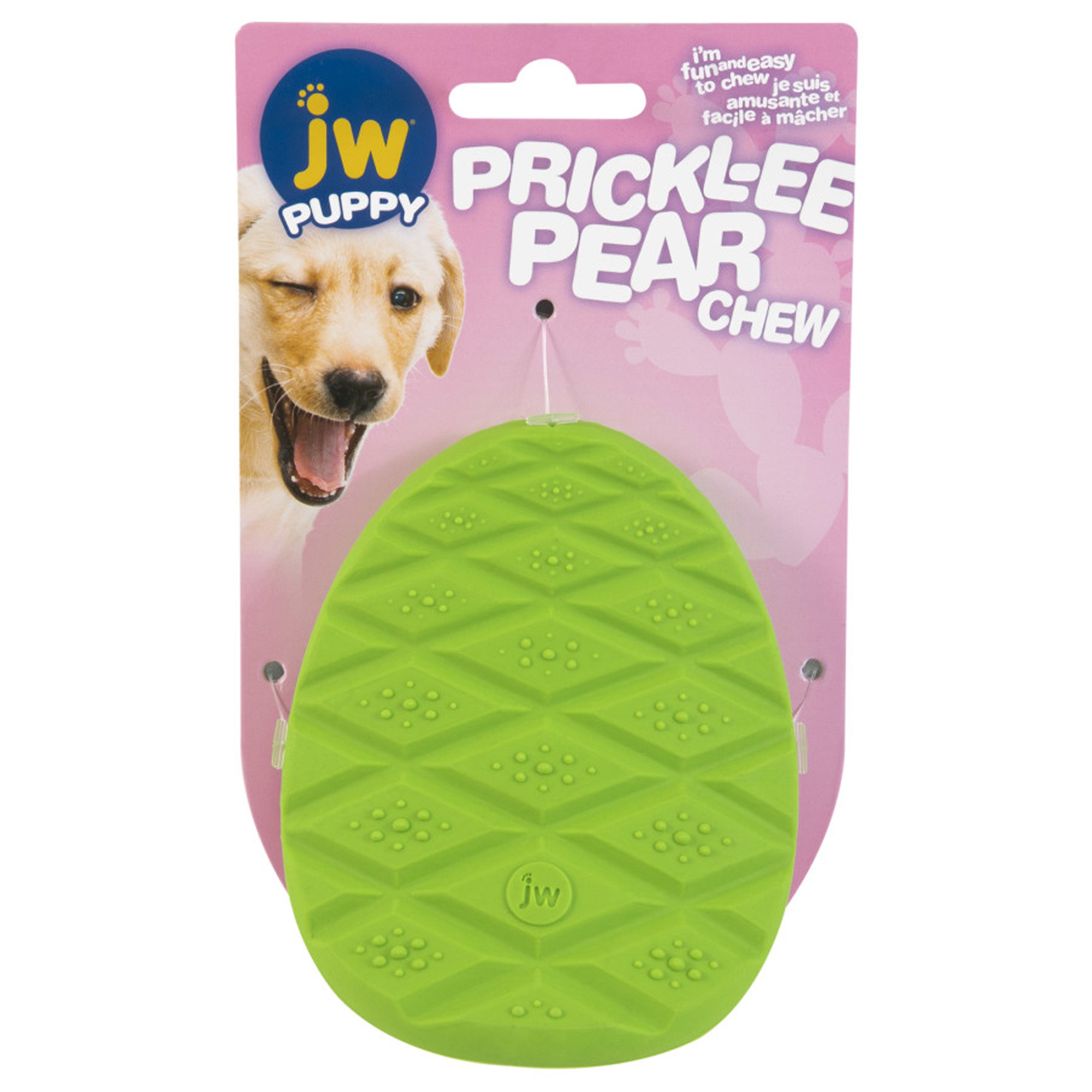 The JW Prickl-ee Pear Puppy Teether is a safe and natural way to ease teething and pain. This chew toy for puppies satisfies their chewing instincts. It is the perfect teething toy that soothes achy gums and cleans your puppys teeth as they chew. Made from safe, durable rubber, this toy has textured surface areas on both sides that provide soothing relief from aching teeth and gums. Made and sized just for puppies, the curved design makes it easy for pups to carry in their mouth or grip with their paws. As your puppy grows, the Prickl-ee Pear Teether promotes daily dental health with its teeth cleaning, textured design.