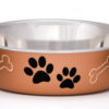 Award winning, patented Bella Dishs? are the BEST SELLING Dish in the pet industry – and for good reason! Functional and beautiful, Bella Dishs are truly the perfect pet dish. Loving Pets brings new life to veterinarian-recommended stainless steel dog Dishs and pet feeding dishes by combining a stainless interior with an attractive poly-resin exterior. A removable rubber base prevents skids and spills, eliminates noise, and makes Bella Dishs fully dishwasher safe. Bella Dishs Classic and Metallics Collection are available in an expanding palette of decorative colors with our paws and bones design. For a decorative design twist, try our Bella Dishs Designer and Expressions Collection, featuring an array of unique designs and colors. Bella Dishs Classics and Metallics Stainless Steel pet dishes come in four sizes, sure to be a perfect fit for your dog, cat or any other pet. Black pawprints and white bones on a metallic copper background.