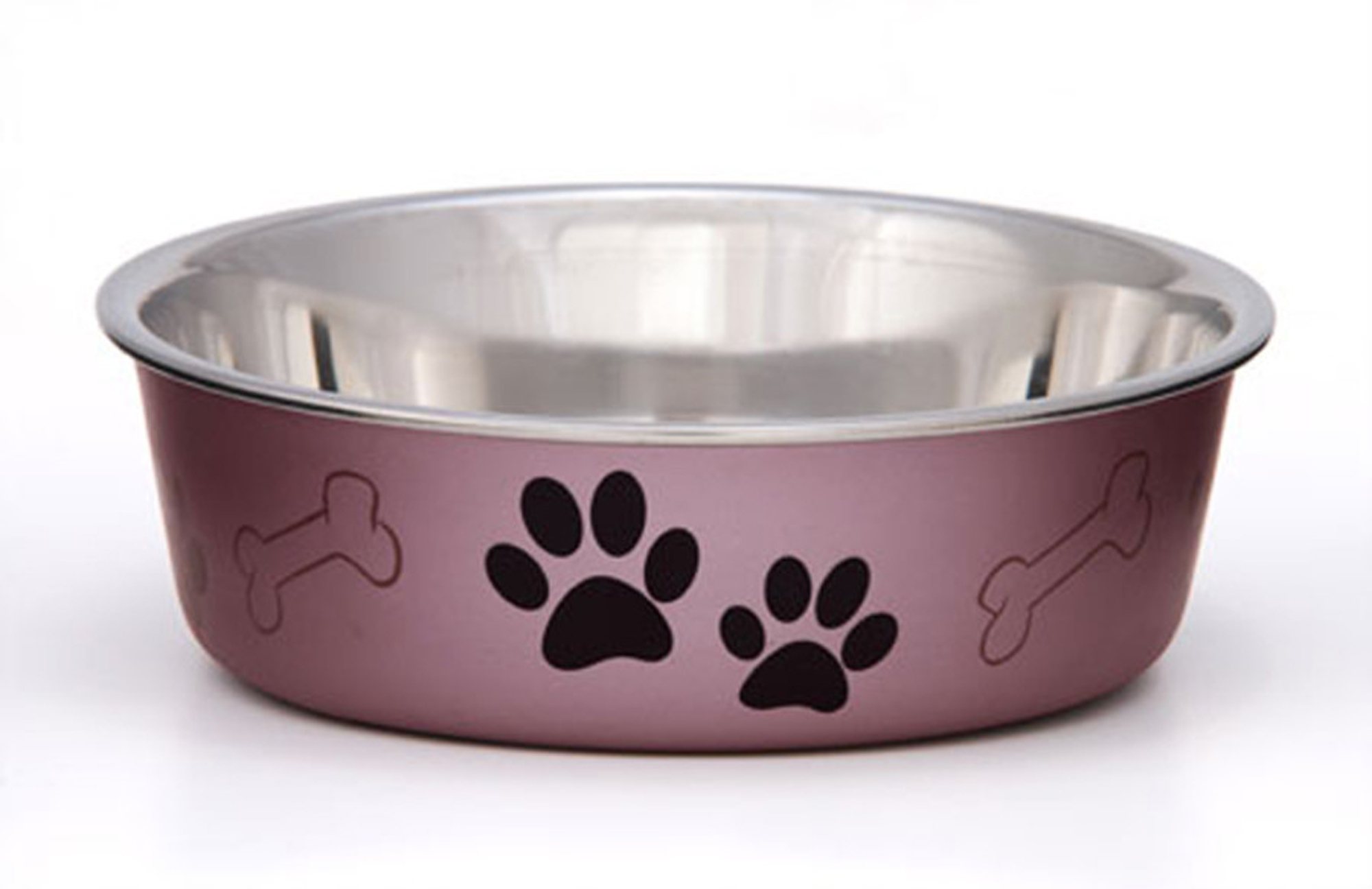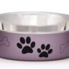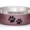 Award winning, patented Bella Dishs? are the BEST SELLING Dish in the pet industry – and for good reason! Functional and beautiful, Bella Dishs are truly the perfect pet dish. Loving Pets brings new life to veterinarian-recommended stainless steel dog Dishs and pet feeding dishes by combining a stainless interior with an attractive poly-resin exterior. A removable rubber base prevents skids and spills, eliminates noise, and makes Bella Dishs fully dishwasher safe. Bella Dishs Classic and Metallics Collection are available in an expanding palette of decorative colors with our paws and bones design. For a decorative design twist, try our Bella Dishs Designer and Expressions Collection, featuring an array of unique designs and colors. Bella Dishs Classics and Metallics Stainless Steel pet dishes come in four sizes, sure to be a perfect fit for your dog, cat or any other pet. Black pawprints and white bones on a metallic copper background.