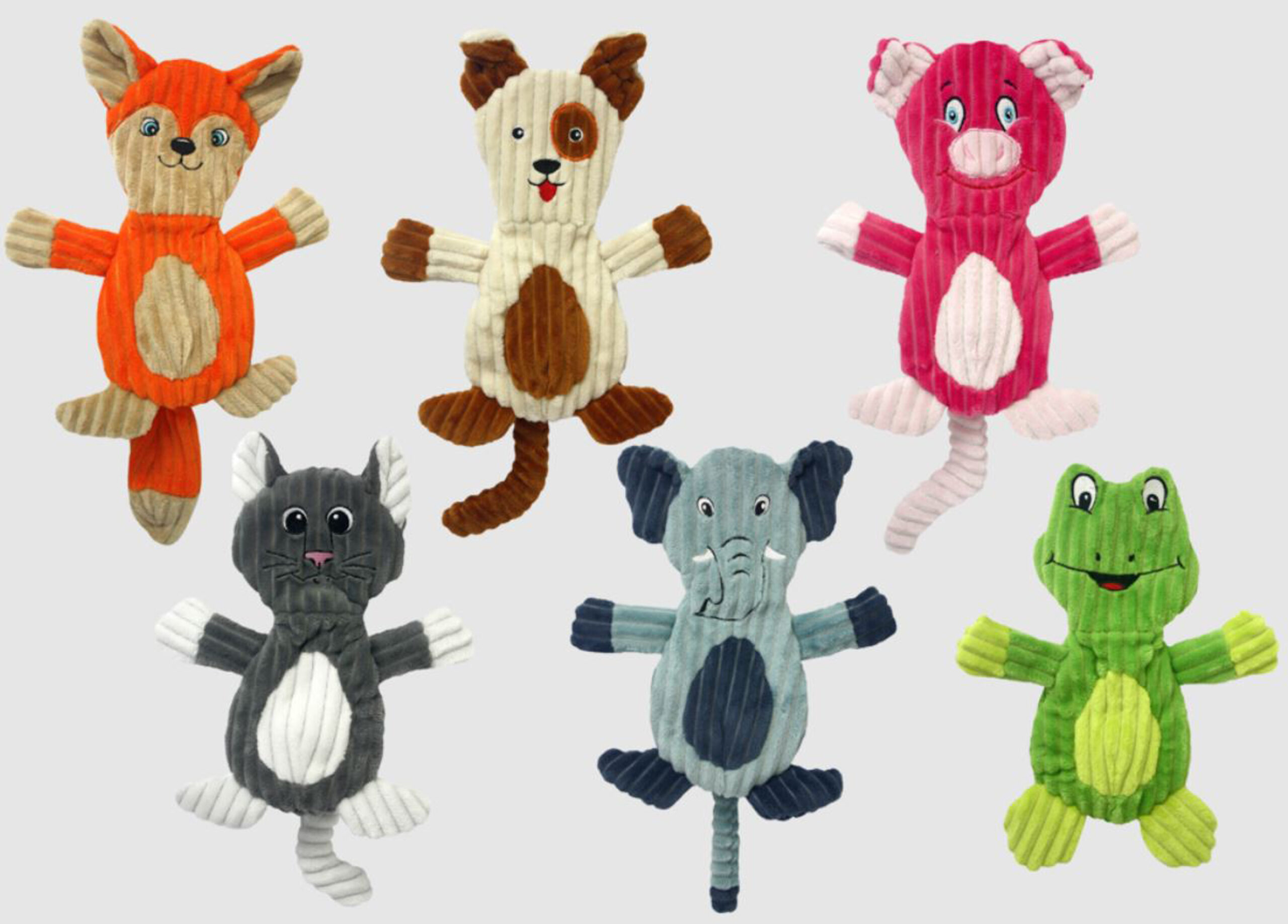 These cute cuddly Flapjacks are made of chenille corduroy fabric. Their crinkly bodies will make any dog go crazy. They are unstuffed and perfect for tossing and shaking. Offered in a large assortment of different animals giving customers the opportunity to buy their favorite or collect them all. Available in cat, dog, elephant, fox, frog and pig.