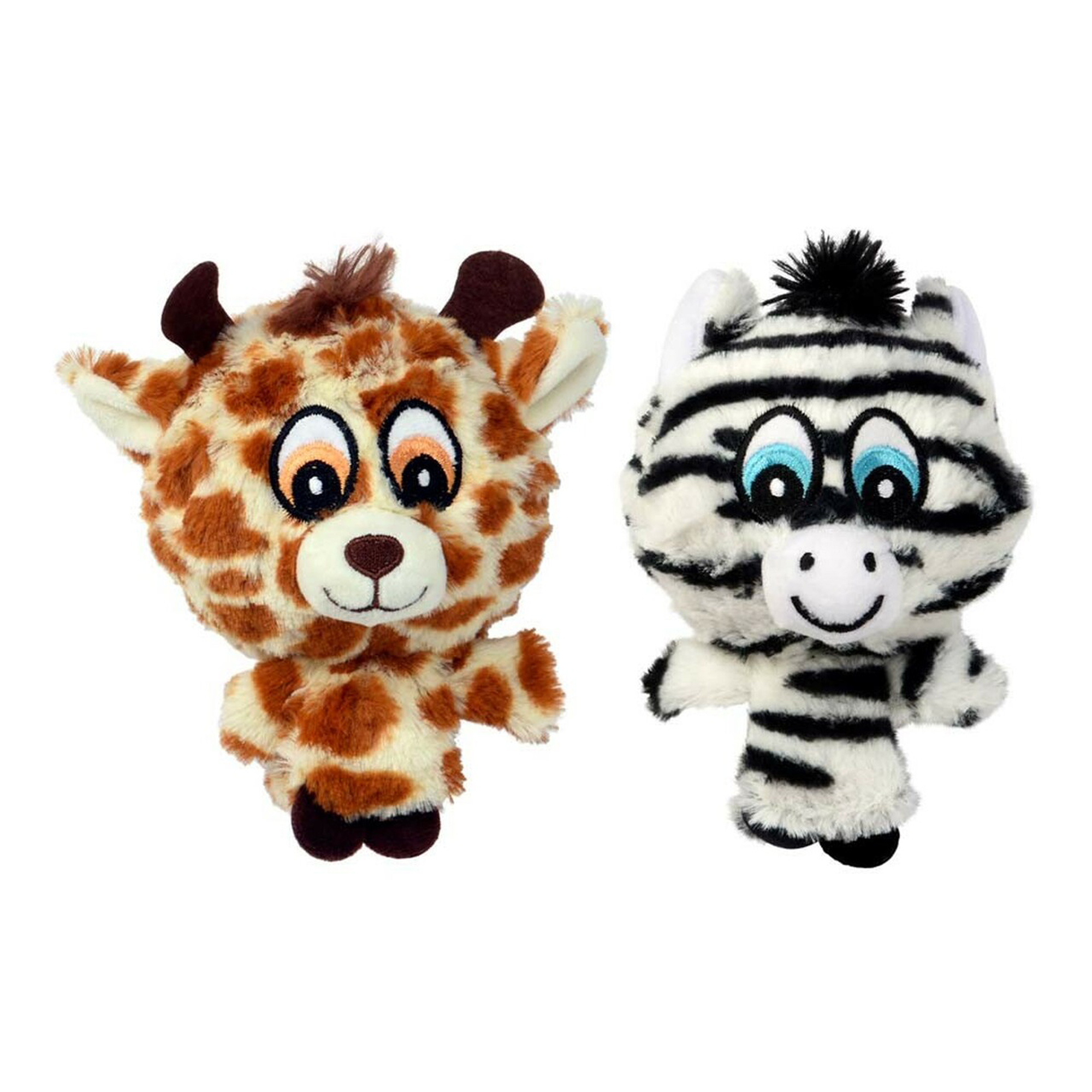 These Knobby Noggins in a safari print have a knobby ball for a head and a small plush body. Dogs love the texture of this toy, and it squeaks too!
