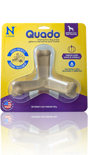 An interactive treat which is all natural, completely edible and digestible with a delicious pumpkin flavor; the chewing action helps to clean teeth by removing plaque and tartarRice Flour, vegetable glycerin, gelatin, water, powdered cellulose, calcium carbonate, sweet potatoes, lecithin, carrageenan (natural seaweed extract), cinnamon, natural pumpkin flavor, brewers dried yeast, peppermint.. Crude Protein Mini 14.0%|Crude Fat Mini 1.5%|Crude Fat Max 2.5%|Crude Fiber Max 4.0%|Moisture Max 15.0%|Calorie Content 2950 kcal ME/kg|41.9 kcal ME/small fry size bone|236.0 kcal ME/average joe size bone|584.0 kcal ME/ginormous size bone”