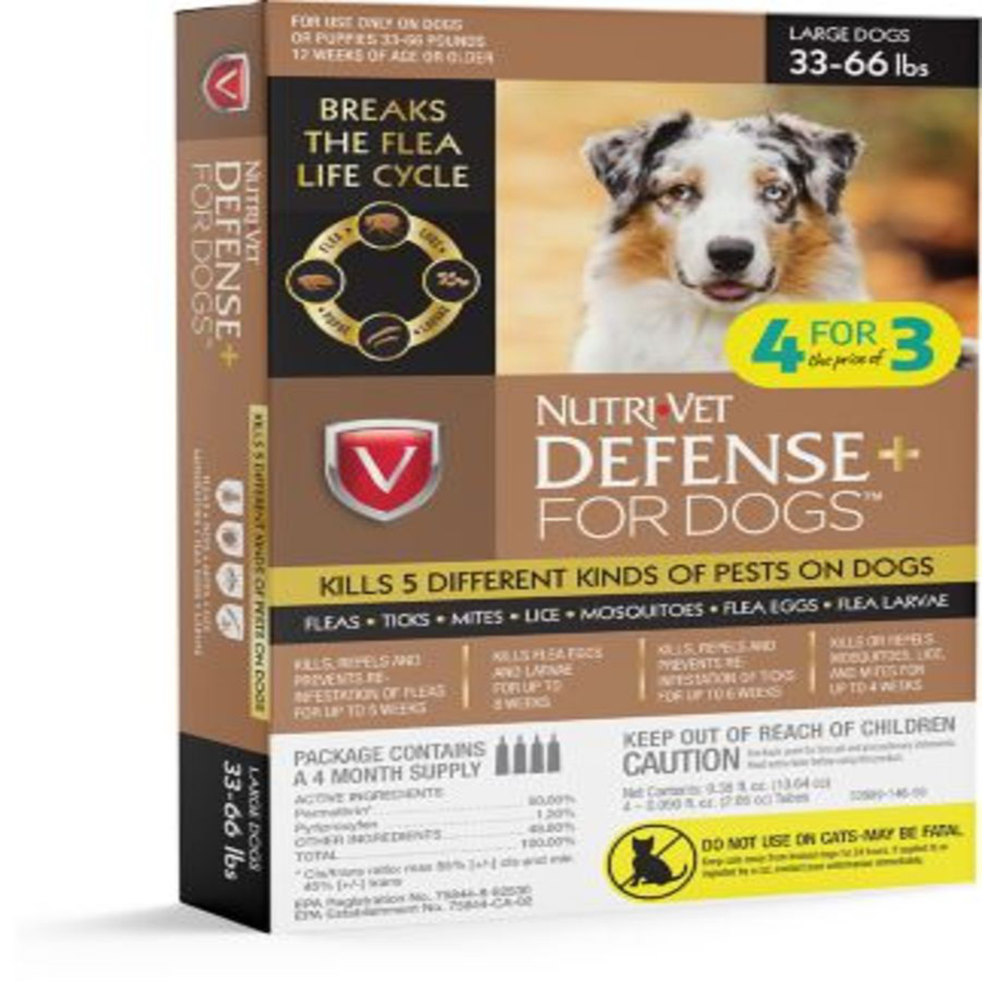 Nutri-Vet Defense Plus Dog Flea and Tick Prevention contains two active ingredients to protect your dog (33-66 lbs) and your home from nasty fleas and ticks. Among the best flea and tick control for dogs, this convenient and easy to apply topical dog flea and tick prevention also fights mosquitoes, lice and mites to keep your dog safe and itch-free. This dog flea and tick prevention kills five different kinds of pest on dogs. Use the flea and tick treatment for dogs on large dogs 12 weeks of age or older. Protect your dog from flea and tick infestation with this dog flea and tick prevention! Bonus pack – 4-month supply package.