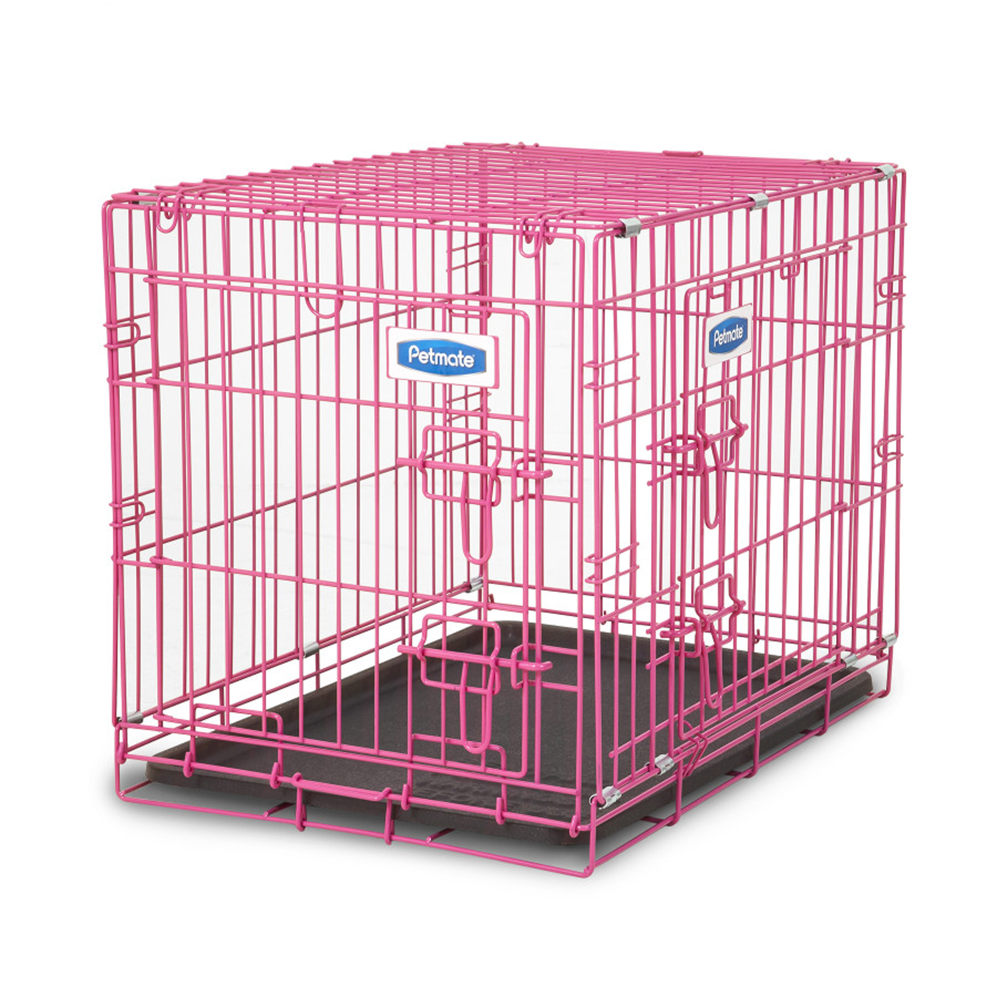 The Petmate? 2 Door Wire Puppy Crate is the perfect tool for house training your new furry friend or simply providing some refuge within your busy home. Designed with your pet’s safety in mind, the Petmate Puppy Crate features a patented 5-Point Locking System that eliminates gaps in the top, sides, and middle of the door increasing the strength and safety of the overall door system. Features a looped wire panel attachment system to provide 25 perfect stronger construction and a rust-resistant electro-coat finish that increases the life of the crate. Purchase comes with a durable, replaceable polypropylene pan for easy cleaning and a divider panel to adjust the size of the crate as your puppy grows. Available in Blue or Pink. Patented 5-Point Locking System|Easy and secure door operation|Easy clean polypropylene pan|Rust-resistant black e-coat finish|Rounded corners|Divider panel-allows crate to grow with puppy (except 19″)|Full color POP box