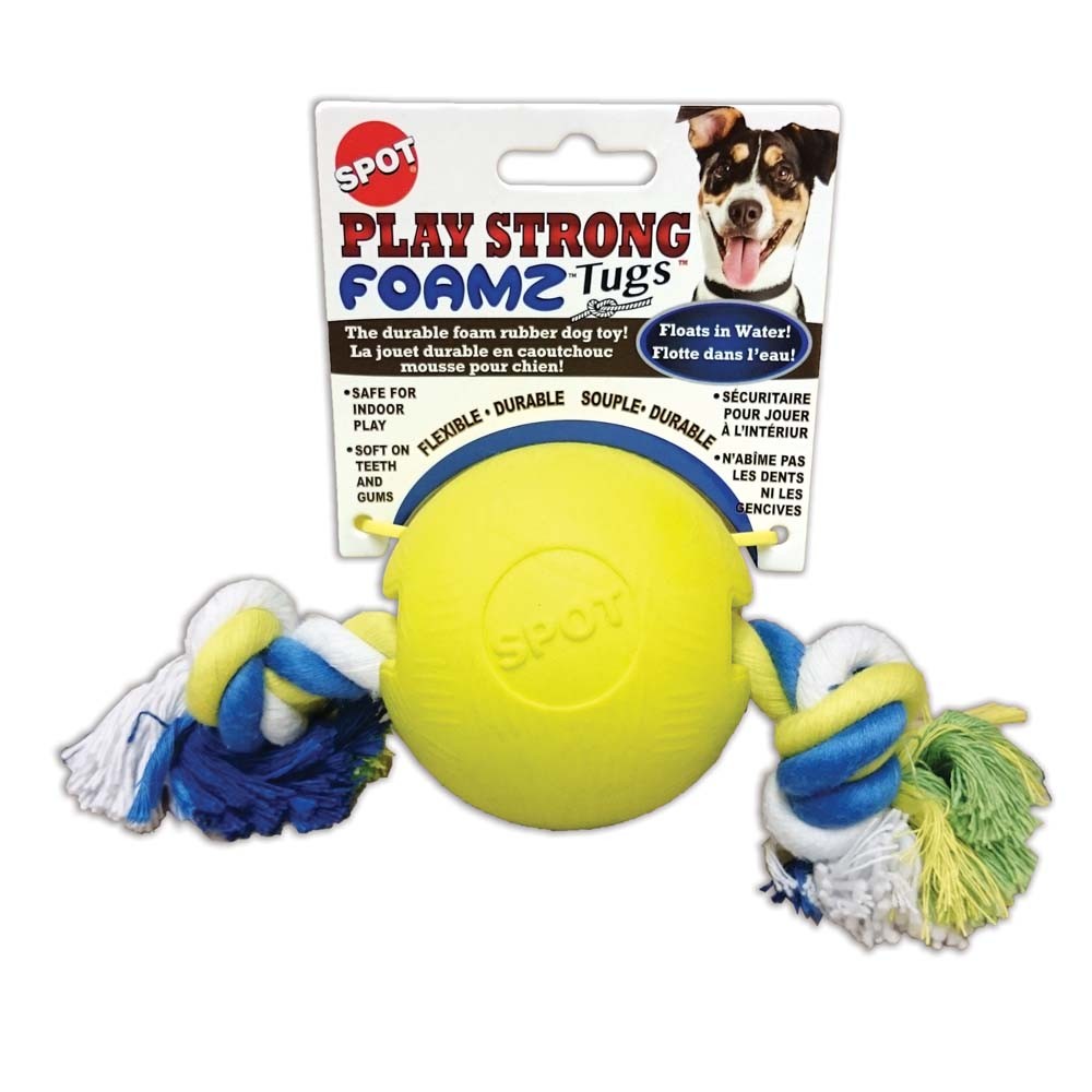 Play Strong Foamz Tugs are durable foam rubber toys with rope, soft enough for dogs to sink their teeth into yet durable enough to hold their shape. Lightweight and float in water, hollow center is ideal for treats or peanut butter. Perfect for indoor or outdoor play.
