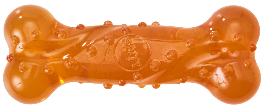 Super durable TPR dog toys infused with peanut butter flavor. Nubs massage teeth and gums for a healthy mouth. Infused with Peanut Butter|Bone|Squeaker for added fun|Nubs for dental health