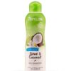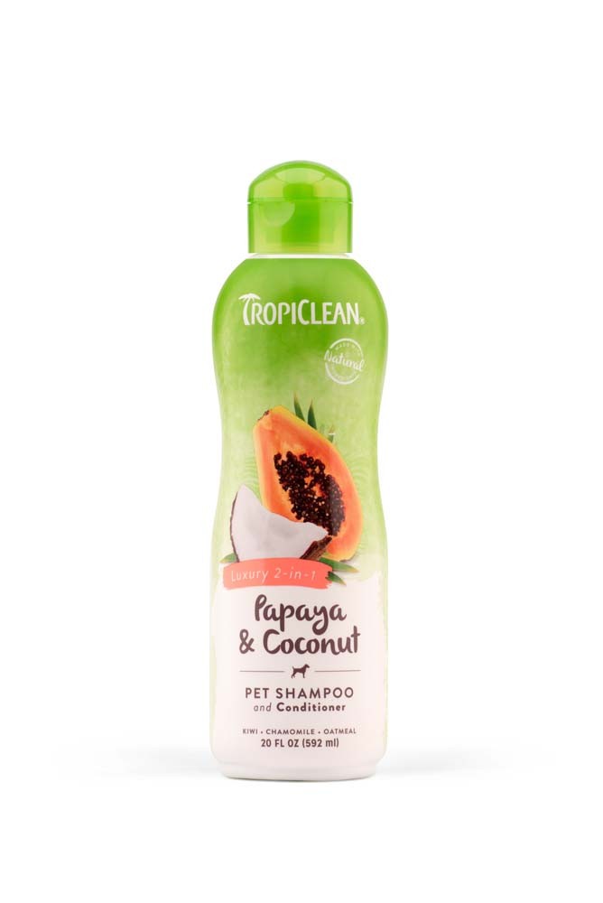 TropiClean Papaya & Coconut Luxury 2-in-1 Dog & Cat Shampoo & Conditioner cleanses, moisturizes and conditions your pets skin and coat in a luxurious lather to help relax tangled hair for easier brushing, leaving their coat soft and healthy. The sweet scent of papaya and coconut will leave them smelling fresh and ready for cuddles! Purified Water, Mild Coconut Cleanser, Hydrolyzed Plant Protein, Avena Sativa Oatmeal, Organic blend of (Awapuhi Extract, Blueberry Extract, Chamomile Extract, Raspberry Extract, Yucca Extract, Mallow Extract), Fragrance, Vitamin E.”