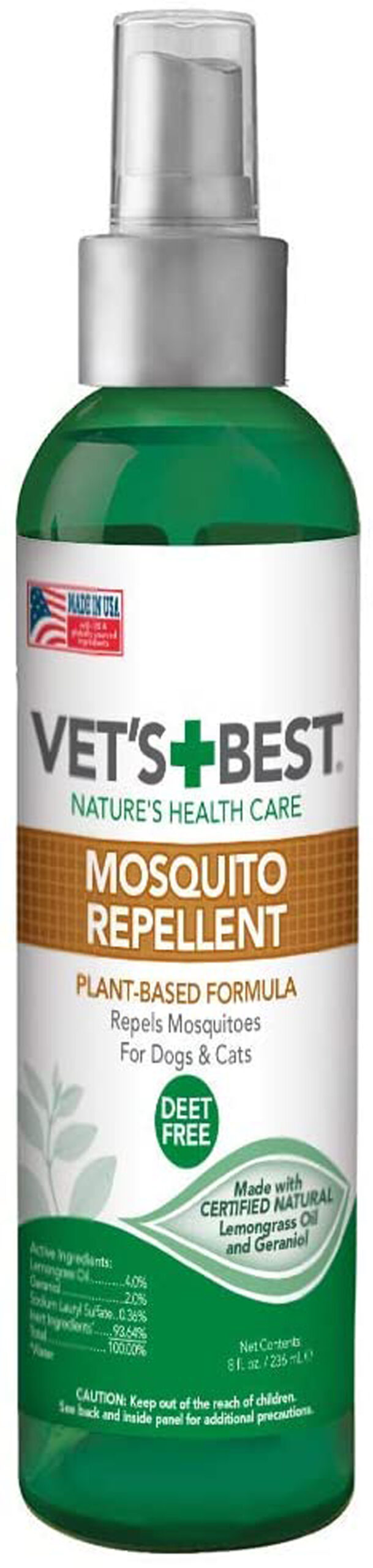 Vet’s Best Mosquito Repellent Spray (8 oz) uses a unique blend of Lemongrass Oil and Geraniol Oil (from Citronella plants) to safely repel mosquitoes. Formula is deet free. Our formulas are independently tested and proven effective at repelling mosquitoes. Can be used directly on dogs and cats 12 weeks or older and people 2 years or older. For over 30 years, Vet?s Best has blended plant-based ingredients that work together to comfort and protect your pet. Our products are a plant-based alternative to traditional chemicals and can be used year-round. For added Mosquito protection, try Vet’s Best Flea and Tick Yard & Kennel Spray that kills mosquitoes in outdoor spaces. Vet’s Best Mosquito Repellent repels mosquitoes without the use of DEET.|Uses plant-based ingredients including certified natural essential oils like Lemongrass Oil and Geraniol (from Citronella plants).|Can be used on dogs and cats 12 weeks or older. Also great forthe whole family.|Can be reapplied every 2 hours as needed.