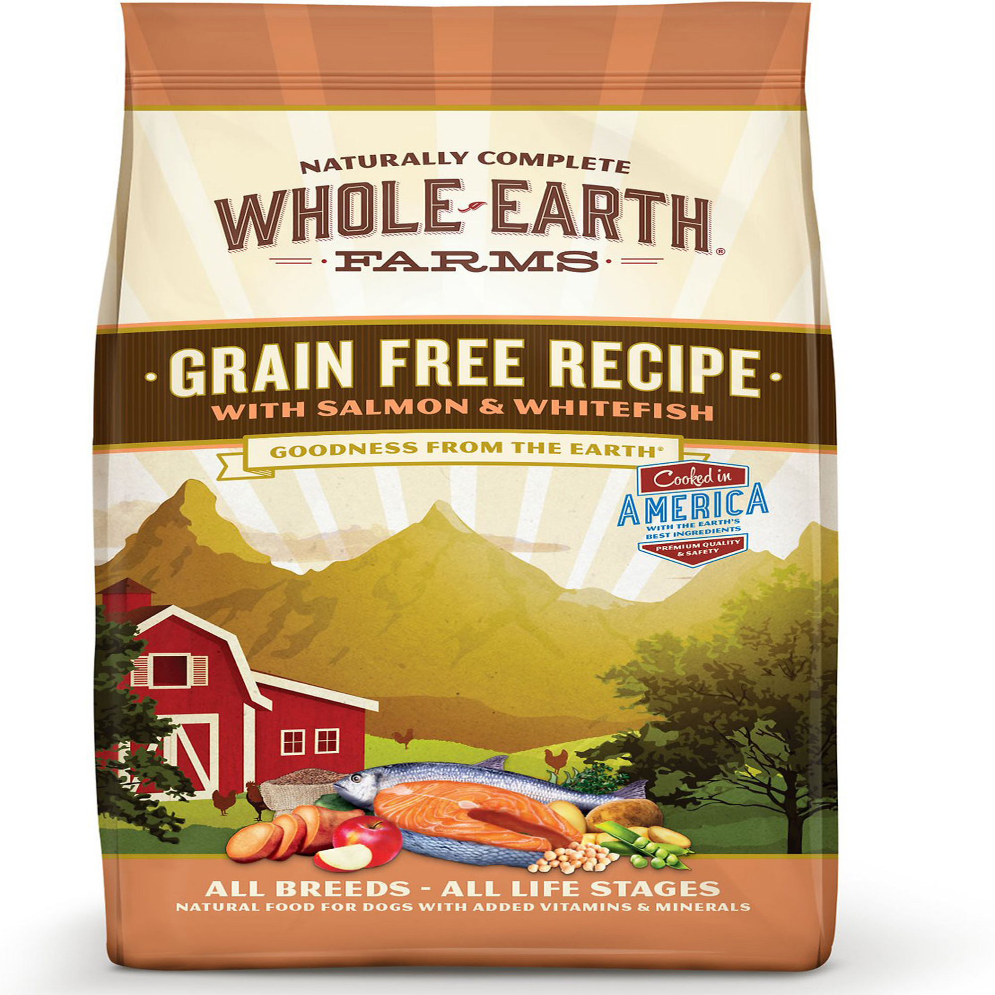 Nourish your furry friend with goodness from the Earth when you feed him Whole Earth Farms Grain-free Salmon & Whitefish Dry Dog Food. This wholesome, delicious recipe is made in the USA with multiple protein sources, including real salmon and whitefish. Add to that omega-rich salmon oil, peas, chickpeas, sweet potatoes and organic alfalfa, along with flavorful herbs and spices, for a complete and balanced grain-free meal he?ll savor. Antioxidant support from real blueberries as well as added vitamins and minerals help make sure your canine companion gets all the nutrition he needs to thrive. High-quality proteins and all-natural ingredients help support easier digestibility, less shedding, shinier coat, increased energy, stronger nails and healthier skin; Grain-free recipe is ideally suited for the pup with food allergies or other food sensitivities; Complete and balanced nutrition is fortified with essential vitamins and minerals to help your furry friend thrive; Contains no corn, wheat, soy or poultry by-products, as well as no artificial colors, flavors or preservatives; Cooked in America with the Earth?s best ingredients to ensure premium quality and safety