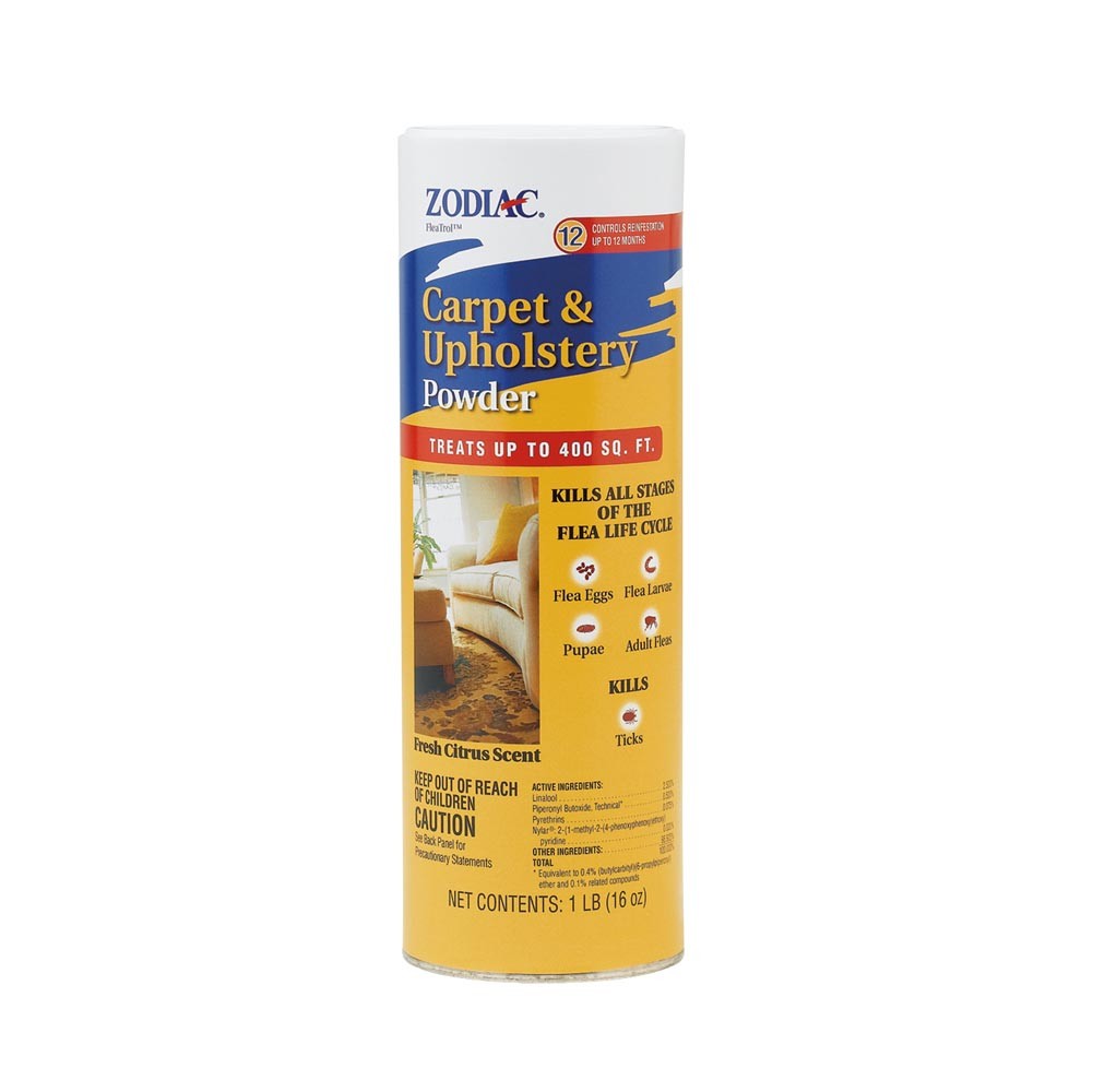 Zodiac Carpet & Upholstery Powder kills all stages of the flea life cycle (flea eggs flea larvae pupae and adult fleas). It controls reinfestation for up to 12 months and treats up to 400 sq. ft. Fresh citrus scent.