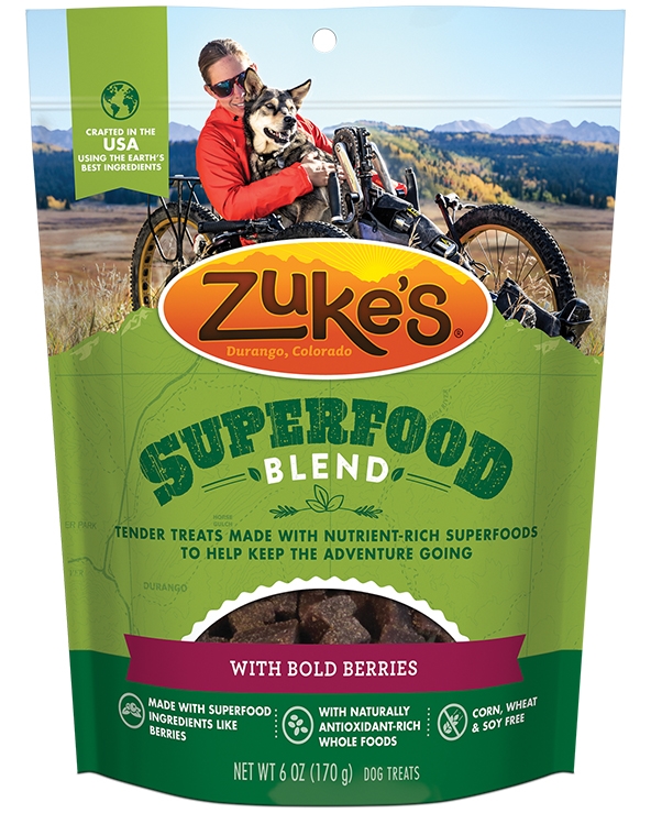 At Zuke?s, we know an active dog is a happy dog. We also know active dogs need extra nutrients. When you want to boost your dog?s intake of antioxidants the natural way ? through food ? superfoods give your dog more benefits per bite. Crafted in the USA using the Earth?s best ingredients like pumpkin, kale, and berries, Zuke’s SuperFood Blends are tender, tasty treats made with naturally antioxidant-rich wholefoods to support your dog?s healthy body and keep the adventure going.