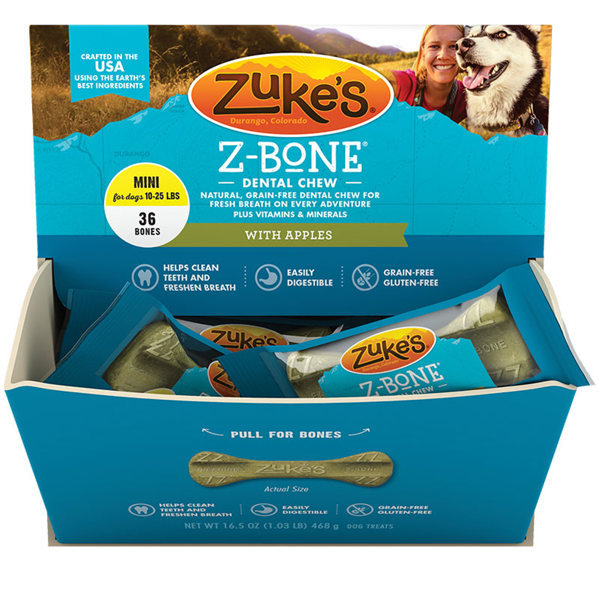 Every adventure is more fun when it includes special moments of closeness with your dog. Make sure those moments are enjoyable for both of you by fighting doggy breath the natural way with Zuke?s Z-Bone Dental Chews. Made with an ideal texture to gently clean your dog?s teeth, each highly digestible Z-Bone is specially crafted in the USA using the Earth?s best ingredients ? like apples and carrots ? and NO wheat, corn, soy or gluten. It?s a delicious way to support your dog?s clean teeth and fresh breath so they can continue to enjoy every adventure you share.